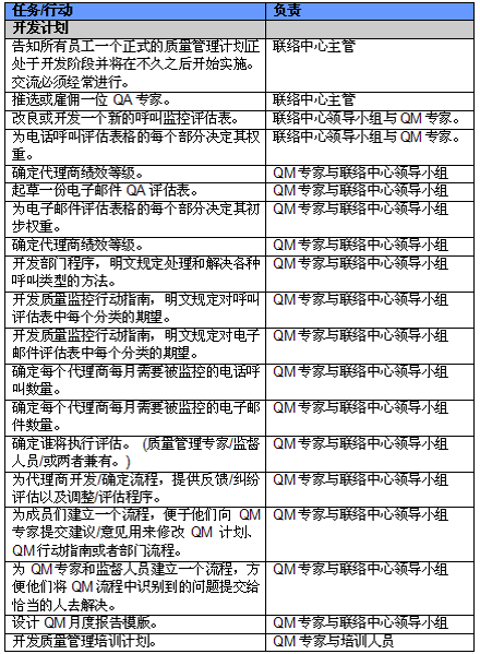 4. 開展項目交流。管理人員必須就新的或者修繕后的QM計劃與代理商進(jìn)行交流。QM的成功與否與代理商的合作密不可分,如果代理商受邀參與新QM計劃的開發(fā)并且所有改變都在雙方之間明確交流過,那么成功的機(jī)會也將大大提高。交流的內(nèi)容應(yīng)包括為什么要開發(fā)這樣一個計劃,它的作用和職責(zé)是什么,它對代理商會產(chǎn)生哪些影響(對于他們的評估和提升)以及它能帶來哪些好處。幫助代理商認(rèn)識到QM計劃積極的一面很重要,因為只有這樣才能讓他們看到QM不僅僅是管理人員用來告訴他們做錯了事情的一種手段。讓聯(lián)絡(luò)中心全體員工參與QM計劃的開發(fā)能夠建立他們對該計劃的支持,提高接受度的同時避免不知所措。這對聯(lián)絡(luò)中心剛剛嶄露頭角,QM計劃還未全面鋪開的中國市場而言尤為重要。