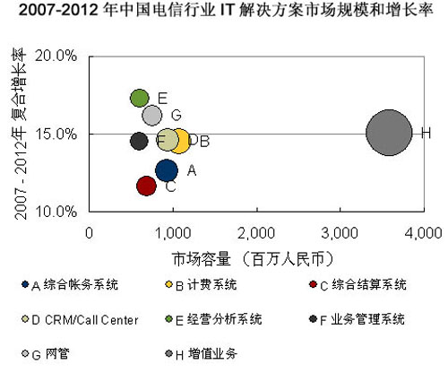 巨大的電信市場蛋糕給產(chǎn)業(yè)鏈的各級廠商都帶來良好的發(fā)展機遇,而其運營支撐系統(tǒng)市場無疑將是增長最快的一部分。據(jù)市場調(diào)查機構(gòu)IDC預計,2007年-2012年電信行業(yè)將注重運營支撐系統(tǒng)的全業(yè)務運營整合和支持前端業(yè)務,因此3G增值業(yè)務、經(jīng)營分析系統(tǒng)、客戶關(guān)系管理系統(tǒng)、IT服務管理系統(tǒng)等建設(shè)將實現(xiàn)快速增長。運營商的已有項目仍然會持續(xù)升級維護,以及配合全業(yè)務運營作出功能上的提升。IDC預計,2012年電信行業(yè)IT解決方案整體市場規(guī)模將達到193.5億元人民幣。