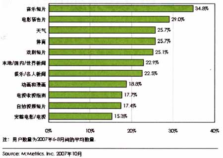 M:Metrics針對(duì)美國(guó)手機(jī)用戶(hù)的研究數(shù)據(jù)顯示,美國(guó)手機(jī)用戶(hù)在訂閱手機(jī)電視內(nèi)容時(shí)偏愛(ài)娛樂(lè)類(lèi)的內(nèi)容,其中音樂(lè)短片、電影預(yù)告片是用戶(hù)需求最大的手機(jī)電視內(nèi)容,另外受到歡迎的是與生活相關(guān)的內(nèi)容及新聞內(nèi)容。