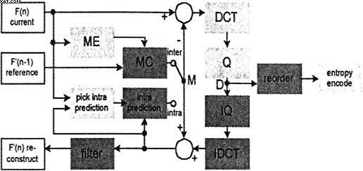 圖1示出H.264編碼器框圖。類似于其他ME基視頻編碼標(biāo)準(zhǔn),它靠宏單元(16×16像素)處理每個(gè)幀宏單元(macroblockMB)。它有一個(gè)前向通路和重建通路。前向通路編碼幀為位。重建通路從編碼位產(chǎn)生1個(gè)參考幀。