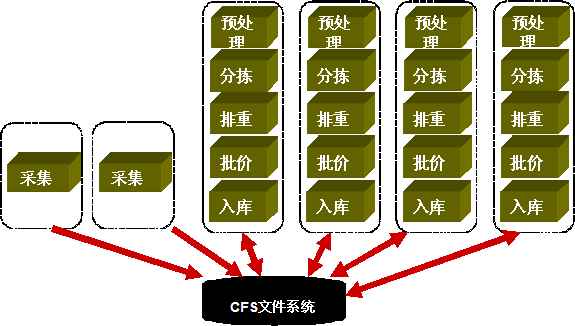 上圖即為江蘇聯(lián)通在新一代BSS計費系統(tǒng)的架構(gòu)描述:6臺計費應(yīng)用主機(jī)共享CFS文件系統(tǒng),兩臺應(yīng)用服務(wù)器負(fù)責(zé)從交換機(jī)采集話單文件,另外4臺應(yīng)用服務(wù)器則負(fù)責(zé)對采集后的話單進(jìn)行預(yù)處理、分揀、排重、批價、入庫等過程。