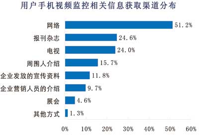 另一方面,運(yùn)營(yíng)商的宣傳不到位。從諾達(dá)咨詢調(diào)查數(shù)據(jù)來(lái)看,用戶目前獲得手機(jī)視頻監(jiān)控相關(guān)信息的主要渠道是互聯(lián)網(wǎng),有51%的用戶是通過互聯(lián)網(wǎng)了解手機(jī)視頻監(jiān)控的,而從傳統(tǒng)的電視媒體和報(bào)刊雜志獲得相關(guān)信息的用戶僅僅約各占24%,通過相關(guān)手機(jī)視頻監(jiān)控企業(yè)發(fā)放宣傳資料和介紹獲取相關(guān)信息的用戶各占12%和10%。由此可見,手機(jī)視頻監(jiān)控的宣傳尚不到位,導(dǎo)致消費(fèi)者不能通過多方渠道獲取相關(guān)信息。