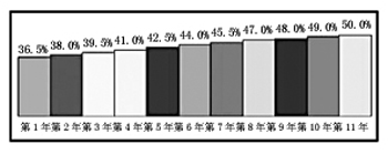 除了分檔包月的語音套餐,KDDI還根據(jù)消費者的不同需求提供了多樣折扣優(yōu)惠,其中包括在網(wǎng)時長優(yōu)惠、家庭優(yōu)惠、個人優(yōu)惠、學(xué)生優(yōu)惠等多種方式(圖1)。多樣優(yōu)惠折扣方式之間也可以通過組合產(chǎn)生新的優(yōu)惠折扣內(nèi)容。例如:在網(wǎng)時長優(yōu)惠與家庭優(yōu)惠共享的套餐在入網(wǎng)的第1年優(yōu)惠折扣達(dá)到40%,此后每續(xù)約1年將增加1%的折扣優(yōu)惠,逐年累積下來,在第11年將享受高達(dá)50%的優(yōu)惠折扣(圖2)。時段優(yōu)惠套餐中體現(xiàn)分時段優(yōu)惠,區(qū)分忙時、閑時,周末時間和工作時間,分別定價。例如,同樣是9500日元的套餐檔次,在時段優(yōu)惠套餐中,周末白天(閑時)的資費是每分鐘10日元,而在非時段優(yōu)惠的普通套餐中,每分鐘的資費是24日元,可見在網(wǎng)絡(luò)閑時可以享受更多的資費優(yōu)惠。而針對學(xué)生和老人設(shè)計的套餐也能享受比普通套餐更優(yōu)惠的資費,這就體現(xiàn)了區(qū)別細(xì)分市場的差異化定價。