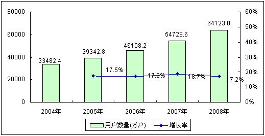 中國移動通信產業(yè)發(fā)展可以追溯到1987年,當時中國確定了以TACS制式作為模擬制式蜂窩移動電話的標準,首次為中國移動通信技術產業(yè)化發(fā)展奠定了基礎。隨著通信技術的進步,數(shù)字化的GSM移動通信網(wǎng)絡制式快速取代了原有的TACS制式。進入2000年以后,伴隨中國改革開放的深入和經濟的進一步轉型,移動通信技術得到迅猛發(fā)展,手機普及率得到迅速提高。2004~2008年,中國移動電話用戶數(shù)量每年都保持著17%以上的快速增長,截止到2008年底,中國移動電話用戶數(shù)量已經達到6.41億戶,與2004年相比增長了近一倍。