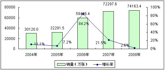 在中國移動用戶快速增長的直接帶動下,中國移動通信卡市場規(guī)模也迅速擴大,此外,基于用戶網(wǎng)間、網(wǎng)內換號以及SP業(yè)務的蓬勃發(fā)展也為中國移動通信卡市場的快速增長注入動力。2004年到2008年,中國移動通信卡市場銷量規(guī)模從3.0億張急劇增長到7.4億張,四年年均復合增長率達到25.3%,移動通信也成為中國智能卡應用的最大市場。