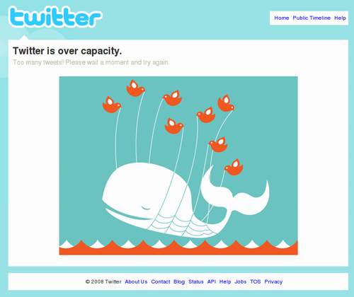 當(dāng)Twitter宕機(jī)或者訪問(wèn)量超過(guò)負(fù)荷時(shí),用戶會(huì)被導(dǎo)向一個(gè)顯示有“失落的鯨魚”的頁(yè)面