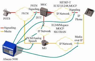 例如,運營商在部署VoIP網(wǎng)絡時,有可能會采用A廠家的軟交換和B廠家的接入網(wǎng)關設備,如何確認這兩家的設備在一起互通時沒有性能上的問題?這時可以采用儀表仿真接入網(wǎng)關下面的模擬線終端,往網(wǎng)關和軟交換側(cè)發(fā)起呼叫,再由軟交換將呼叫路由回網(wǎng)關再到終端。通過這種方式,由儀表發(fā)起成千上萬的呼叫經(jīng)過接入網(wǎng)關和軟交換,可以有效地驗證這兩種設備在互通的時候有沒有性能和穩(wěn)定性問題。