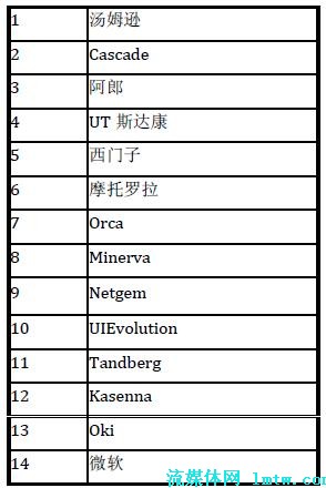 在中國市場上,UT 斯達康和中興公司暫時領(lǐng)先于其他公司。其中,UT 斯達康在海外也有不俗的表現(xiàn),如在印度和日本市場等;華為公司可以借助其整體解決方案的實力,有機會在下一代基于IMS 的IPTV 解決方案中脫穎而出。MRG 曾經(jīng)在2007 年3 月公布過一個市場調(diào)查,對IPTV 中間件及其市場影響力進行了一個排名,具體的結(jié)果見表1。