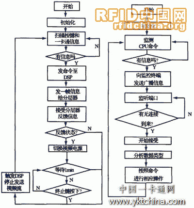 對于底層軟件,主要是門口終端的控制軟件,其工作流程如圖5所示。門口終端上電后,先進行初始化工作,然后開始掃描按鍵和一卡通信息,當確認有變化時,微處理器CPU l先給分層器發(fā)送一幀信息,并且監(jiān)聽分層器的反饋信息,同時啟動DSP通過網(wǎng)絡(luò)端口發(fā)送廣播消息給監(jiān)控終端,以便啟動監(jiān)控終端的接受線程接受視頻流和訪問信息或一卡通信息。當時間超過l min或終止鍵按下時,雙方終止通信,門口終端與監(jiān)控終端之間由CPU1觸發(fā)DSP中斷,使其停止發(fā)送視頻流數(shù)據(jù)。