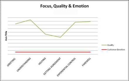 第二張圖片中客戶在很生氣的狀態(tài)下開始呼叫,而代理除了幫助階段外表現(xiàn)得都很好。該代理執(zhí)行的是最低績(jī)效標(biāo)準(zhǔn),但他對(duì)客戶的影響卻等于零。分析師提出了一個(gè)非常明顯而重要的關(guān)節(jié)——幫助是整個(gè)呼叫中最為重要的環(huán)節(jié)。這就是我們要做的事情。如果在幫助這一環(huán)上沒做好,那么其它環(huán)節(jié)如感謝客戶、問候客戶等等都變得無足輕重。