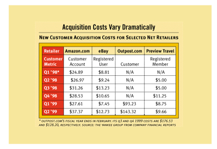上世紀(jì)90年代末期DOT.COM就遭遇了這一嚴(yán)峻問題。70% - 80%的客戶在沒有完成采購之前就棄網(wǎng)站而去。對(duì)于許多人來說這被認(rèn)為是一個(gè)“行業(yè)基準(zhǔn)”,屬于可接受水平,但也有些人開始尋找解決方案。整個(gè)行業(yè)開始注意到分析家們的忠告:這一水平的放棄率是不被允許的。下面這張由Yankee集團(tuán)在2000年發(fā)布的表格向我們展示了電子商務(wù)企業(yè)客戶獲取成本螺旋形盤升的過程。