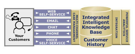 Technologies”是一家非常著名的多接觸點(diǎn)呼叫中心供應(yīng)商,這家公司建議采用“通用事故”追蹤機(jī)制,它強(qiáng)調(diào)報(bào)表和歷史紀(jì)錄必須作為任何一個(gè)多接觸點(diǎn)聯(lián)絡(luò)中心不可或缺的組成部分!癛ightnow”提供的以下插圖很清楚地向我們展示了多渠道知識(shí)庫集成是如何被強(qiáng)制執(zhí)行的。