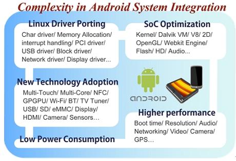 對廠商而言,開發(fā)一款A(yù)ndroid設(shè)備,不僅僅只是將所有零組件組合成為一個產(chǎn)品那么容易,最大的學(xué)問便在于將系統(tǒng)單芯片(System-on-a-chip,SoC)、各種新技術(shù)和Android系統(tǒng)進行整合,SoC涉及像是Dalvik Virtual Machine、OpenGL、V8、Webkit Engine等上層的演算,與Android間的結(jié)合便必須透過不斷的嘗試與驗證,才能研發(fā)出既符合成本效益、又有良好效能的優(yōu)化產(chǎn)品。目前市面上有些SoC廠商已針對Android系統(tǒng)的特性,提供整合過的SoC平臺,將藍(lán)牙、相機或上網(wǎng)等常用功能模組預(yù)先寫入,減少終端成品廠商費力整合開發(fā)的時間,但對廠商而言,這樣的預(yù)先整合是否適合自身產(chǎn)品,以及是否需要再作更細(xì)致的修改,則又是更困難的課題。