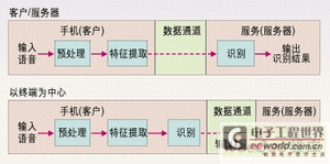 3G手機(jī)的ASR應(yīng)用設(shè)計(jì)可分為兩類,即以終端為中心和以客戶/服務(wù)器為中心的應(yīng)用。如圖1所示為以終端為中心的設(shè)計(jì)方法,3G手機(jī)(終端)執(zhí)行整個(gè)語(yǔ)音識(shí)別過(guò)程并送出識(shí)別結(jié)果。在圖2所示的客戶/服務(wù)器方法中,終端只是執(zhí)行預(yù)處理特征提取,然后通過(guò)一個(gè)誤碼受保護(hù)的數(shù)據(jù)信道將這些參數(shù)發(fā)送給中心服務(wù)器,中心服務(wù)器最終完成語(yǔ)音識(shí)別。如果采用以客戶/服務(wù)器為中心的設(shè)計(jì)方法,3G手機(jī)應(yīng)使用數(shù)據(jù)信道而非移動(dòng)信道來(lái)將語(yǔ)音發(fā)送給服務(wù)器進(jìn)行識(shí)別,因?yàn)橐苿?dòng)信道所用的低速率語(yǔ)音編碼會(huì)嚴(yán)重影響語(yǔ)音識(shí)別的性能。