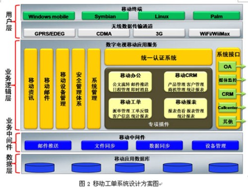 移動工單系統(tǒng)是在Windows Mobile智能手機(jī)操作系統(tǒng)上自主研發(fā),采用B/S和C/S混合架構(gòu),以TCP/IP作為基礎(chǔ)數(shù)據(jù)傳輸協(xié)議,通過移動通信網(wǎng)絡(luò)無線數(shù)據(jù)通道GPRS/EDGE/CDMA1x等,將呼叫中心的工單數(shù)據(jù)推送到智能手機(jī)上,由外勤服務(wù)人員將服務(wù)情況進(jìn)行實(shí)時(shí)的反饋。利用的同步中間件可將最新的資訊文件推送到手機(jī)終端上,服務(wù)人員無需登錄即可在終端可以查看最新的廣電資訊,可支持doc、xls、ppt等 Office文檔格式的瀏覽,支持WMV、WAV、3GP多種音視頻文件播放。服務(wù)人員可以不受地點(diǎn)和時(shí)間的限制通過終端實(shí)時(shí)獲取最新的多媒體客戶交互中心運(yùn)營數(shù)據(jù)報(bào)表,圖2為系統(tǒng)設(shè)計(jì)方案圖。