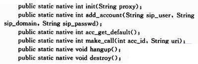 由于Java中的數(shù)據(jù)類型與C/C++不盡相同,因此還必須注意參數(shù)傳遞時參數(shù)類型的轉(zhuǎn)換。本文所涉及到的Java數(shù)據(jù)類型有String和int型,Javah生成的頭文件中會先定義好需要傳遞的參數(shù)類型以及函數(shù)返回類型,例如方法“add_account(String sip_user,Stringsip_dom-ain,String sip_passwd)”,在頭文件中將定義函數(shù)的形式為“JNIEXPORT jint JNICALL Java_com_android_IMSandroid_pjsip_add_lac-count(JNIEnv*,jclass,jstring,jstring,jstring)”,其中JNIEXPORT為JNI外部函數(shù)聲明,jint是“jni.h”中定義C語言中整形的對應(yīng)類型,JNCALL是JNI關(guān)鍵字。比較特殊的是JNIEnv,它是一個指向類型為JNIEnv_的一個特殊JNI數(shù)據(jù)結(jié)構(gòu)的指針,它的每個元素都指向一個JNI函數(shù)的指針,jclass會根據(jù)引用Java類的不同而不同,本文中“pjsip.class”是靜態(tài)類,因此這里的jclass指的是類本身,如果是非靜態(tài)類則指的是對象。后面幾個就是pjsip類需要傳遞的參數(shù),根據(jù)“jni.h”的定義,String類型對應(yīng)jstring,int對應(yīng)jint。然而這只是函數(shù)申明與類中方法的形式對應(yīng),參數(shù)的具體傳遞還需要相應(yīng)的轉(zhuǎn)化,具體實(shí)現(xiàn)將在下一節(jié)詳細(xì)介紹。