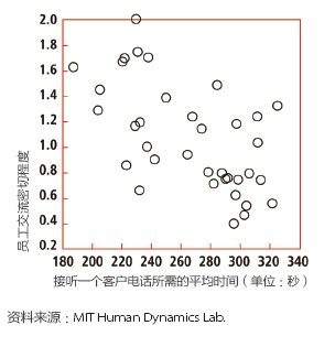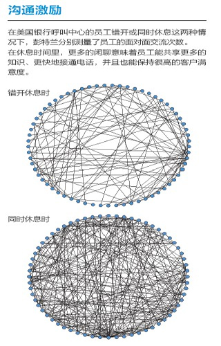 去年,彭特蘭的實(shí)驗(yàn)室與美國銀行(Bank of America)設(shè)在羅得島(Rhode Island)的呼叫中心合作,在80 名中心員工身上安裝了社會(huì)傳感器。這種傳感器看起來像一枚不顯眼的徽章,使用藍(lán)牙和紅外信號(hào)監(jiān)測實(shí)驗(yàn)對(duì)象每分鐘與哪些同事交談。測試活動(dòng)先開展了一個(gè)月,后來又進(jìn)行了6周。第一個(gè)月后,實(shí)驗(yàn)室的研究人員發(fā)現(xiàn),與更多同事進(jìn)行過交談的員工能夠更快地接通電話,他們自我感覺的壓力也相對(duì)較小,而客戶滿意度卻與其他人一樣高。與刻板地遵循員工手冊或服從經(jīng)理的電子郵件指示相比,通過非正式的閑聊來交流問題和解決方案似乎能取得更好的結(jié)果。有了這種結(jié)論之后,該呼叫中心嘗試盡量將員工的休息時(shí)間安排在一起,而非像過去那樣錯(cuò)開。這樣員工就有了更多的時(shí)間參與閑聊。幾個(gè)月后,美國銀行向?qū)嶒?yàn)室報(bào)告了結(jié)果:該呼叫中心獲得了相當(dāng)于每年1,500 萬美元的生產(chǎn)力提升。