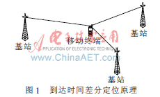 TDOA定位技術(shù)是根據(jù)不同基站接收到的同一移動終端信號在傳輸路徑上的時延差異實現(xiàn)終端定位。當(dāng)移動終端發(fā)出緊急呼叫時,移動網(wǎng)絡(luò)通過其附近的三個或更多個不同基站接收并測量出信號的到達(dá)時間,網(wǎng)絡(luò)計算出到達(dá)時間兩兩之間的差值,移動終端必然位于這些時間差值所對應(yīng)的以兩兩基站為焦點(diǎn)的雙曲線上[2]。這樣,根據(jù)兩條雙曲線的交點(diǎn)就能夠確定手機(jī)的位置。所以只要附近三個基站接收到移動終端發(fā)出的信號就可以達(dá)到定位目的。TDOA技術(shù)只需要移動通信網(wǎng)絡(luò)參與網(wǎng)絡(luò)參數(shù)的測量,不需要對終端硬件上的改動。因此實現(xiàn)TDOA定位只需要在移動通信網(wǎng)中增加相應(yīng)功能模塊就可以了,并支持所有廠商生產(chǎn)的移動終端。同時它具有定位精度高、響應(yīng)時間短、實現(xiàn)簡單等優(yōu)點(diǎn)。