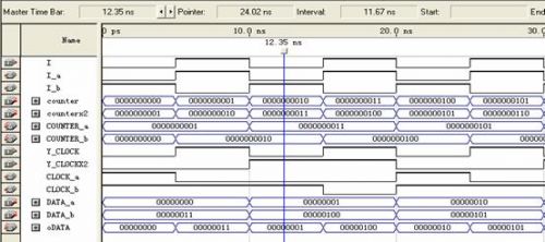 使用的信號(hào)包括:數(shù)據(jù)信號(hào)data_a,dat_b;讀寫有效信號(hào)wren_a,wren_b;地址信號(hào)address_a,address_b;時(shí)鐘信號(hào)clock_a,clock_b;輸出數(shù)據(jù)信號(hào)q_a,q_b?梢钥吹剿械男盘(hào)都是成對出現(xiàn)的,就是為了進(jìn)行乒乓方式的數(shù)據(jù)傳輸。分成了兩個(gè)RAM區(qū)域,A和B,相當(dāng)于前面講乒乓方式里的數(shù)據(jù)緩沖模塊1和2。兩個(gè)RAM塊是交替著讀寫(由I_a和I_b決定),輸出數(shù)據(jù)流也是由I決定。剛說到寫時(shí)鐘是13.5M,讀時(shí)鐘是27M,所以clock_a和clock_b必須是讀寫時(shí)鐘切換著輸入,而且地址的計(jì)數(shù)也不一樣,寫周期時(shí)候地址增加的時(shí)鐘是13.5M,讀周期地址增加的時(shí)鐘是27M。所以每行的數(shù)據(jù)讀了兩遍,相當(dāng)于隔行變逐行。圖6在Qartus II下RAM的乒乓操作功能仿真圖: