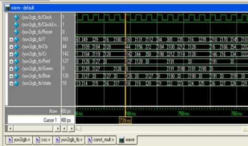 主模塊yuv2rgb實(shí)現(xiàn)子模塊的調(diào)用,用Modelsim進(jìn)行了仿真。仿真波形如圖7所示: