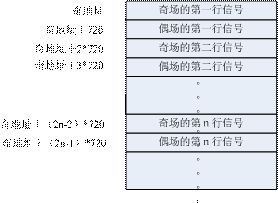 第1種:將一幀的數(shù)據(jù)存儲(chǔ)下來,根據(jù)奇偶場的不同(區(qū)分可以根據(jù)XY),在寫周期的時(shí)候,因?yàn)槠鎴龅男兄g有偶場的信號(hào),所以寫數(shù)據(jù)的時(shí)候需要跳地址寫,根據(jù)行同步信號(hào)(或者SAV也可以)來區(qū)分行,換行的時(shí)候地址要加額外的720(用來存放夾雜在奇場信號(hào)中的偶場信號(hào)),直到出現(xiàn)偶場信號(hào)(也就是XY=1)地址切換為初始基地址加720,其余的同奇行的處理方法,具體的地址分配表參照圖4。