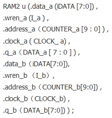 方法2 可以這樣實(shí)現(xiàn):在FPGA內(nèi)部使用Megacore,構(gòu)造一個(gè)雙口的RAM,雙口RAM的輸入輸出信號(hào)的硬件描述語言定義如下: