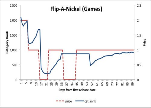 觀察那些熱門(mén)付費(fèi)應(yīng)用的運(yùn)營(yíng)策略,你會(huì)發(fā)現(xiàn)一個(gè)通行的做法——降價(jià)。降價(jià)的好處是使應(yīng)用的排名的快速上升。熱門(mén)付費(fèi)應(yīng)用在它們整個(gè)生命周期內(nèi)至少會(huì)降價(jià)一次。以上圖ASD公司開(kāi)發(fā)的娛樂(lè)應(yīng)用FlipANickel為例,應(yīng)用發(fā)布時(shí)的價(jià)格為1.99美元。七天后,應(yīng)用降價(jià)至0.99美元的同時(shí)排名從2200飆升至229。