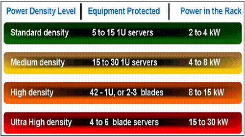 當企業(yè)部署刀片式服務器來宿主其虛擬服務器時尤其如此。刀片式服務器采用多個即插即用型處理裝置,它們共享公共的電氣系統(tǒng)、電源、風扇、電纜和存儲器。這樣的安排節(jié)省了數(shù)據(jù)中心的占地面積,簡化了硬件管理,并提高了IT靈活性。然而,這同時也大大增加了運算密度。結(jié)果,刀片式服務器產(chǎn)生大量的熱,從根本提高了機柜級供電要求。確實,一個典型的傳統(tǒng)服務器機柜可能需要4至6 kW電力,而一個典型的布滿刀片式機架的機柜則可能需要高達30 kW的電力,遠遠超過許多電源和冷卻系統(tǒng)的處理能力。