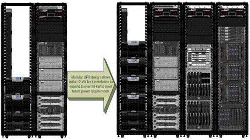 模塊化UPS設計允許最初的12kW N+1架構(gòu)設備擴展至36kW以上,以滿足未來的電源要求。