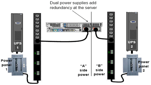 2(N)架構(gòu)與含有雙電源的服務器配合使用。在這種排列中,每個電源一般都是利用一個獨立的供電路徑。那樣,即使整個動力總成都關(guān)機進行維修或維護,服務器仍然可用。