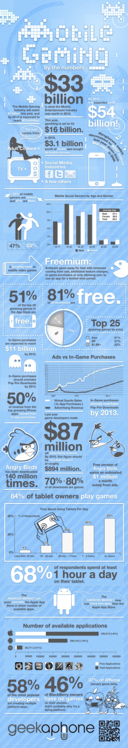 隨著移動(dòng)互聯(lián)網(wǎng)浪潮的興起,大家玩游戲的平臺(tái)逐漸從傳統(tǒng)的游戲機(jī),PC,TV向新興的智能手機(jī)和平板電腦等移動(dòng)終端遷移。PC時(shí)代的游戲巨頭EA,育碧等公司的光芒不再,PopCap,Rovio和Zynga等新興游戲公司出品的游戲則吸引著越來越多的玩家。照目前強(qiáng)勁的發(fā)展趨勢(shì)來看,移動(dòng)游戲在未來將取得像PC游戲現(xiàn)在的地位,成為游戲市場(chǎng)的主力。關(guān)注移動(dòng)終端發(fā)展的博客Geekaphone制作了下面這張超大信息圖,用詳細(xì)的統(tǒng)計(jì)數(shù)字展示了移動(dòng)游戲發(fā)展的強(qiáng)勁趨勢(shì)。