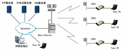 上文介紹的主要測(cè)試領(lǐng)域側(cè)重實(shí)驗(yàn)室環(huán)境,運(yùn)營(yíng)商在對(duì)設(shè)備經(jīng)過(guò)一定程度上的實(shí)驗(yàn)室測(cè)試后,一般會(huì)進(jìn)一步進(jìn)行外場(chǎng)測(cè)試。在外場(chǎng)測(cè)試中,覆蓋、容量、多終端下的QoS保證、移動(dòng)性、長(zhǎng)時(shí)傳輸能力等方面將成為重點(diǎn)的測(cè)試內(nèi)容,下面就針對(duì)固定WiMAX技術(shù),對(duì)其部分外場(chǎng)測(cè)試內(nèi)容進(jìn)行介紹(典型外場(chǎng)測(cè)試框圖參考圖3)。