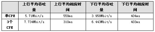 下面給出單扇區(qū)范圍內(nèi),在64QAM調(diào)制格式的工作方式下,單個(gè)CPE工作和三個(gè)CPE同時(shí)工作時(shí)的吞吐量和響應(yīng)時(shí)間的典型測(cè)試結(jié)果,業(yè)務(wù)類(lèi)型均為BE。