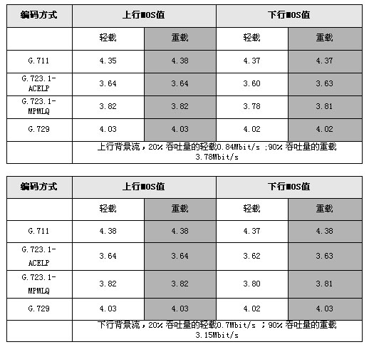 表2和表3是對(duì)于64QAM3/4調(diào)制格式信號(hào)在背景流輕載(20%)和重載(90%)條件下的VoIP性能典型評(píng)估結(jié)果。