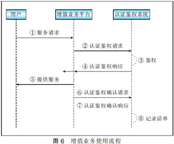 用戶在使用增值業(yè)務(wù)時(shí),增值業(yè)務(wù)系統(tǒng)通過接口向認(rèn)證鑒權(quán)系統(tǒng)發(fā)起實(shí)時(shí)用戶鑒權(quán)請求,認(rèn)證鑒權(quán)系統(tǒng)按照用戶付費(fèi)類型對用戶進(jìn)行鑒權(quán),并對預(yù)付費(fèi)用戶進(jìn)行實(shí)時(shí)計(jì)費(fèi)處理,成功后向增值系統(tǒng)反饋信息;對后付費(fèi)用戶,產(chǎn)生原始使用記錄。