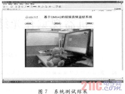 在集成開發(fā)環(huán)境CCS(C6000)下,加載相關驅動程序,對本系統(tǒng)進行了測試。CCD攝像頭為標準PAL制式,圖像采集的幀頻為25幀/s,圖像的分辨率為720×576像素。測試結果如圖7所示。測試結果表明,網絡連接正常,用戶在PC端可通過瀏覽器訪問系統(tǒng),成功實現(xiàn)遠程監(jiān)控。