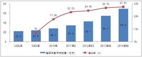 根據(jù)對(duì)下游行業(yè)的調(diào)研和關(guān)聯(lián)市場(chǎng)的分析,2010年,中國(guó)指揮調(diào)度市場(chǎng)規(guī)模已達(dá)到28.1億元。隨著下游行業(yè)投資規(guī)模的擴(kuò)大、產(chǎn)品的升級(jí)換代及技術(shù)的發(fā)展,行業(yè)市場(chǎng)規(guī)模將保持較快的增長(zhǎng)速度,未來(lái)4年的復(fù)合增長(zhǎng)率為26.31%,2014年,市場(chǎng)規(guī)模將達(dá)到69.8億元。