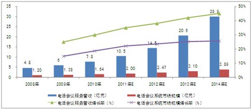 圖表 4 2008-2014年中國(guó)電話會(huì)議市場(chǎng)規(guī)模及增長(zhǎng)率