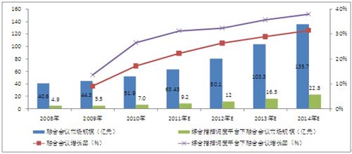 圖表 5 2008-2014年中國(guó)融合會(huì)議市場(chǎng)規(guī)模及增長(zhǎng)率
