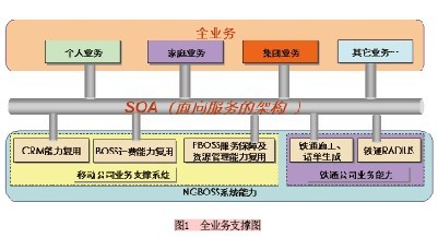 為了適應全業(yè)務競爭的需要,長遠規(guī)劃業(yè)務支撐系統(tǒng),移動采用SOA(Service Oriented architecture,面向服務的架構)技術對業(yè)務支撐系統(tǒng)進行了改造,并把鐵通資源融合進SOA架構,改造項目以業(yè)務支撐系統(tǒng)SOA架構為基礎,進行寬帶業(yè)務合營和IPPBX固話業(yè)務合營,構建基于SOA架構的一體化服務營銷支撐體系。