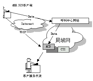 國際上一些先進的 呼叫中心產品供應商現(xiàn)在已經把 Web 技術引入到他們的產品中了。通過屏幕上的一個按鈕可以利用 Internet 電話把客戶和呼叫中心連接起來?蛻羰褂靡粋很普通的帶有麥克風﹑聲卡以及傳輸速率不小于 28.8 kbps 的Modem 的多媒體 PC 機,并配有 Web 瀏覽器以及與 H.323兼容的應用軟件就可以利用把他們連接到 Web 站點的那條電話線與呼叫中心的座席員交談。其簡單示意圖如下: