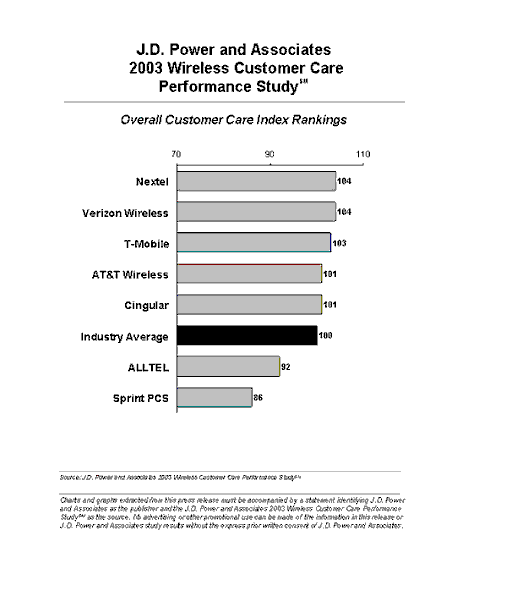 Nextel和Verizon移動在全部七家大型移動服務(wù)提供商的客戶服務(wù)表現(xiàn)中并列前茅。Nextel在自動應(yīng)答系統(tǒng)方面的表現(xiàn)特別好,尤其是指引/提示部分。Verizon移動則是在所有各個(gè)方面都表現(xiàn)超過平均值,特別是讓客服代表理解客戶的問題和比較短的打入客服中心后的電話等待時(shí)間方面。