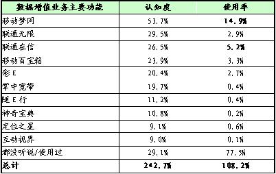 數(shù)據(jù)增值業(yè)務品牌認知度較高的是移動夢網(wǎng)、聯(lián)通無限等,而使用率很低