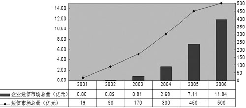有數(shù)據(jù)顯示,2002年企業(yè)短信市場(chǎng)總量為0.09億元,2003年增長(zhǎng)到0.81億元,預(yù)計(jì)2006年將突破10億元。終于,中國(guó)移動(dòng)和中國(guó)聯(lián)通先后推出了面向企業(yè)用戶的“集團(tuán)短信”業(yè)務(wù),運(yùn)營(yíng)商對(duì)這個(gè)市場(chǎng)的重視使得一個(gè)新的產(chǎn)業(yè)鏈逐步完善起來(lái),短信也開(kāi)始“潤(rùn)物細(xì)無(wú)聲”地改變著國(guó)內(nèi)企業(yè)的一些習(xí)慣。