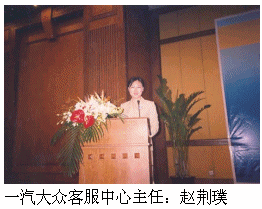 一汽大眾客服中心主任趙荊璞由于其在客戶服務方面的杰出貢獻被評為"2005中國最佳呼叫中心管理人",并作為獲獎代表在大會上發(fā)了言。?