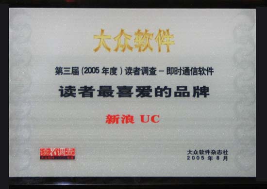 8月24日,在國內知名IT媒體《大眾軟件》創(chuàng)刊10周年慶典上,《大眾軟件》隆重公布了“《大眾軟件》第三屆(2005年度)讀者調查報告”,新浪UC以12.20%的市場占有率,逼近排名第二的MSN(17.81%),實至名歸在國內IM市場獲得第三的成績,并獲得《大眾軟件》頒發(fā)的“第三屆(2005年度)讀者調查——即時通訊軟件”市場“讀者最喜愛的品牌”(圖一)。
