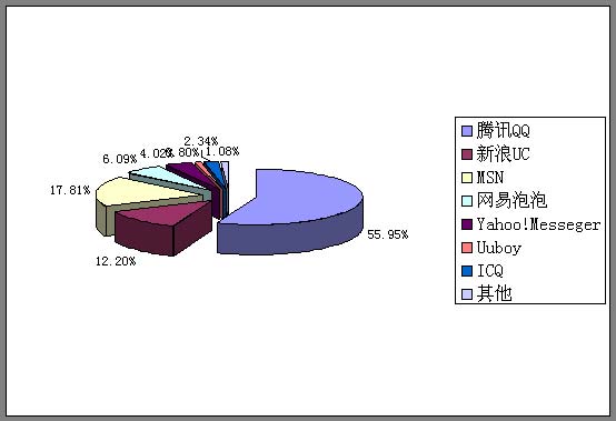 根據(jù)本次報告的“即時通信軟件使用情況分析”,新浪UC僅比排名第二的MSN相差5個百分點,并以超過一倍的相當優(yōu)勢超越排名第四、第五的其他IM軟件。至此,國內IM領域已經形成了以騰訊QQ、微軟MSN、新浪UC三大巨頭“瓜分天下”的格局,三者之和牢牢掌控了國內IM領域將近86%以上的市場份額(圖二)。