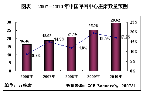 計世資訊(CCW Research)的研究成果《2006-2007年中國呼叫中心市場研究報告》預計,2007-2010年中國呼叫中心的產(chǎn)業(yè)投入規(guī)模平均年度復合增長率將超過20%,預計2007年中國呼叫中心投入規(guī)模將達到337.19億元,同比增長24.8%。由于2007、2009兩個年度中國呼叫中心將開始更換新的系統(tǒng)平臺,并開拓遠程座席市場,因此2007年的呼叫中心座席規(guī)模增長率高于2006年,2009年的呼叫中心座席規(guī)模增長率高于2008年。預計2007年中國呼叫中心座席數(shù)量將達到18.92萬個,同比增長14.9%;而2006年呼叫中心座席數(shù)量的同比增長率僅僅是8.7%,可見2007年的增長率比2006年的高出6.2個百分點。計世資訊(CCW Research)研究認為,2007年成為中國呼叫中心產(chǎn)業(yè)發(fā)展的轉(zhuǎn)折點,2007年中國開始進入第二波呼叫中心建設(shè)高潮期。