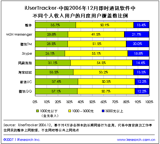 根據(jù)iResearch艾瑞市場咨詢最新推出的網(wǎng)民連續(xù)用戶行為研究系統(tǒng)iUserTracker的最新數(shù)據(jù)表示,2006年12月,即時通訊軟件的月度總覆蓋用戶數(shù)為10183萬人,比2006年11月上升了0.8%,其中使用騰訊QQ的用戶最多,占94%,MSN Messenger排名第二,占35.6%,淘寶旺旺排名第三,占29%。在最近四個月內(nèi),即時通訊類軟件的月度總覆蓋用戶數(shù)總體保持增長。