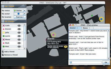 有了iFind,MIT的學(xué)生就能立即看到哪些朋友在線以及在什么地方。然后,用戶可以使用嵌入式客戶程序,通過即時通信(IM)的方式與對方進(jìn)行聯(lián)系,安排會面地點(diǎn)。